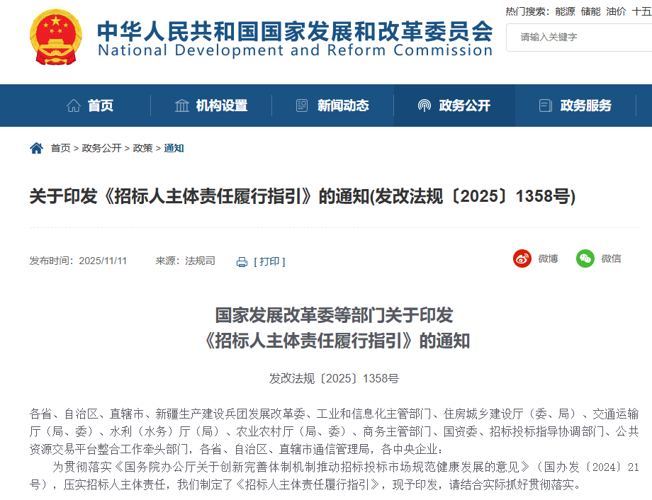 國家發(fā)展改革委等部門印發(fā)《招標(biāo)人主體責(zé)任履行指引》(發(fā)改法規(guī)〔2025〕1358號(hào))