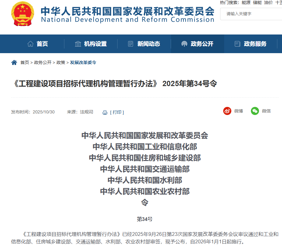 《工程建設(shè)項(xiàng)目招標(biāo)代理機(jī)構(gòu)管理暫行辦法》已經(jīng)2025年9月26日第23次國家發(fā)展改革委委務(wù)會(huì)議審議通過和工業(yè)和信息化部、住房城鄉(xiāng)建設(shè)部、交通運(yùn)輸部、水利部、農(nóng)業(yè)農(nóng)村部審簽,現(xiàn)予公布,自2026年1月1日起施行。